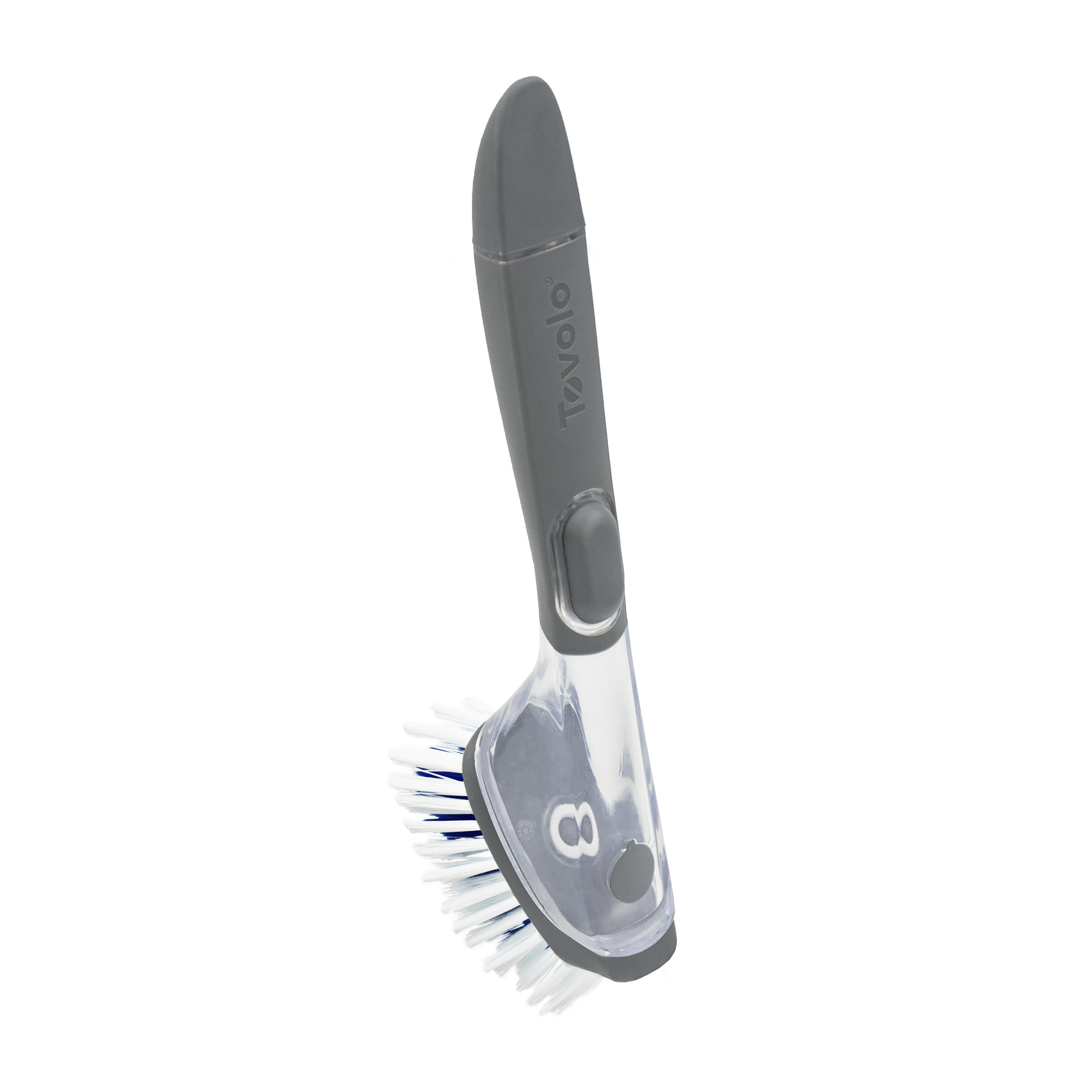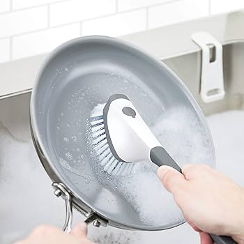Strong magnets allow for in-sink storage. Handle features a non-slip, ergonomic grip. Easy-fill handle keeps dish soap at the ready. Durable nylon bristles effortlessly clean baked-on food and grease. Top edge of the brush doubles as a pan scraper. Made of BPA-free plastic and nylon.