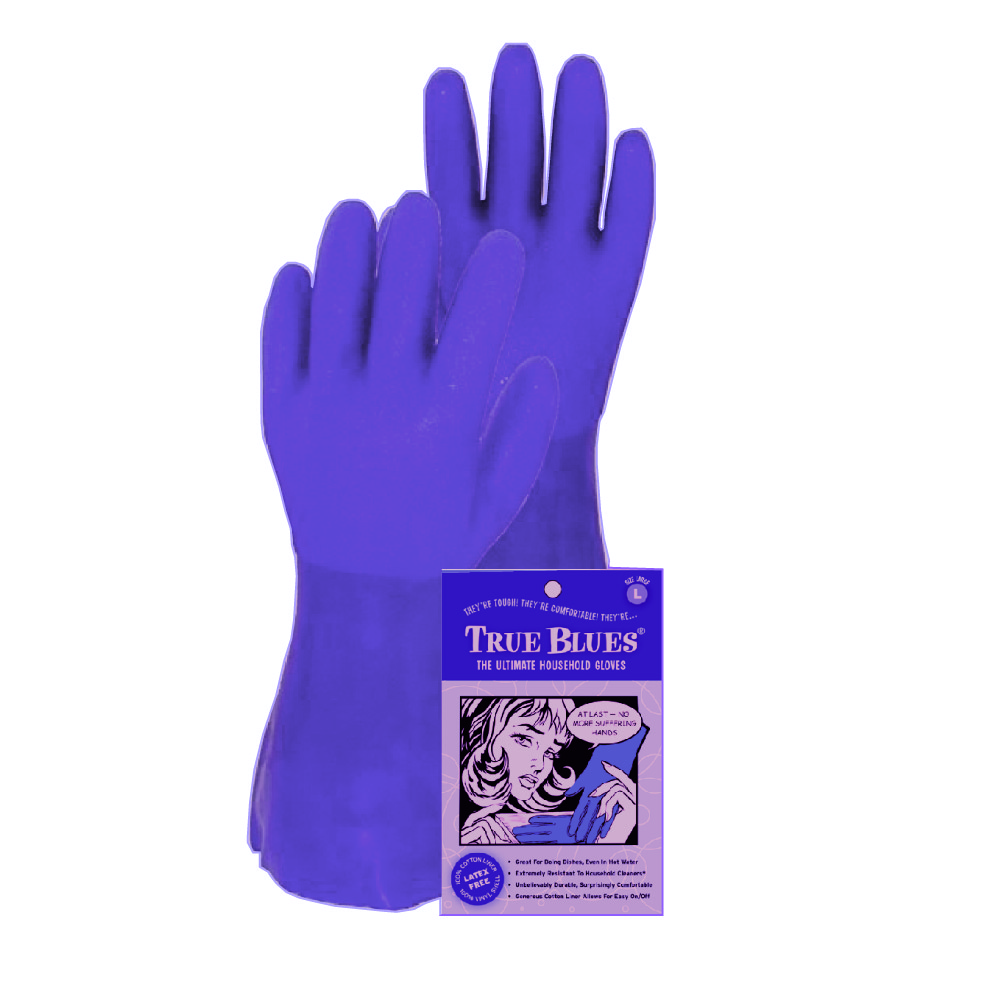 True Blues Ultra Gloves™ —the ultimate choice for household protection and comfort. Engineered with a tough vinyl shell and a 15 Gauge moisture absorbing polyester fleece liner, these gloves offer unbeatable durability and a snug, comfortable fit. Designed to withstand hot water and household chemicals, True Blues Gloves keep your hands safe from drying and cracking, making them an essential addition to your cleaning routine. Latex-free and machine washable, True Blues Ultra Gloves™ provide excellent flexibility and grip, ensuring you can handle tasks with precision and ease. Unlike traditional latex or rubber gloves, True Blues Ultra Gloves™ are resistant to cracking and wear, offering long-lasting performance. With their combination of toughness, flexibility, and ultra-comfortable design, these are quite possibly the most comfortable household gloves you'll ever own.