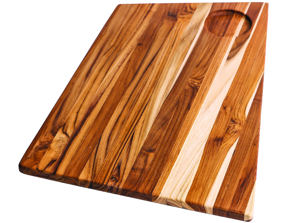GEO COLLECTION - Trapeze Cutting & Serving Board with Carved Hole for BowlChop your veggies on one side of the board for making a delicious salsa and serve your favourite snacks on the other side while keeping your salsa bowl in place. Edge Grain, Reversible. 100% Sustainable teakwood. Handwash only, do not soak. FSC Certified Product. Teak is a tropical wood with a high oil content that acts as a moisture-resistant barrier. Its medium hardness provides a luxurious cutting experience and keeps your knives sharp. For mainteining use just a few drops of mineral oil, your boards will look like new again. Our zero-waste production process helps to minimize our environmental impact. All our teakwood comes from sustainable forests. FSC-certified, which means every purchase helps preserve nature, support sustainable forestry, protect biodiversity, conserve forests, and support local communities.