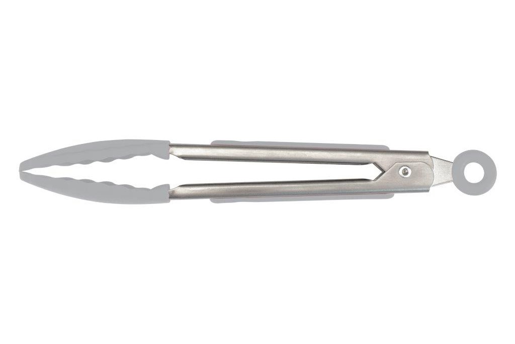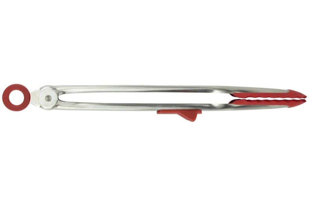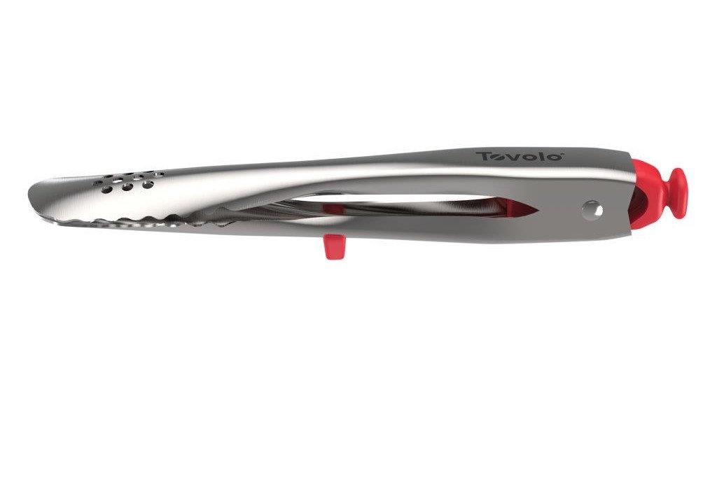 7in. tongs perfect for serving and small kitchen tasks. Perforations on one side for draining excess liquid. One-handed click-and-lock mechanism. Resting foot keeps your counters clean. Made of stainless steel.