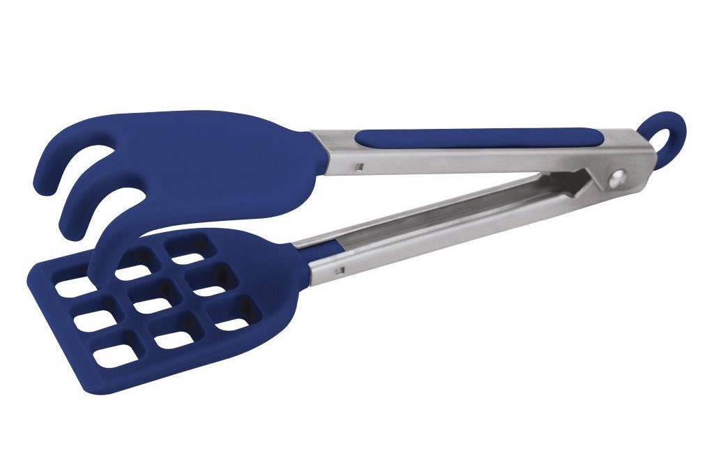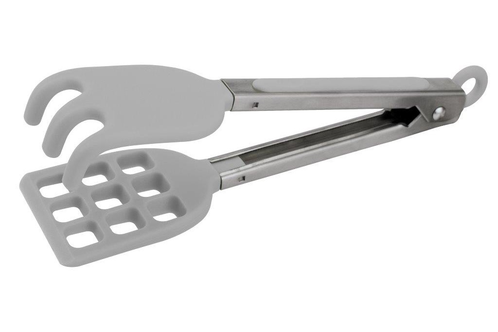 11in. tongs keep hands away from the heat. Great for grilling. Perforations on one side for draining excess liquid. One-handed click-and-lock mechanism. Resting foot keeps your counters clean. Made of stainless steel.