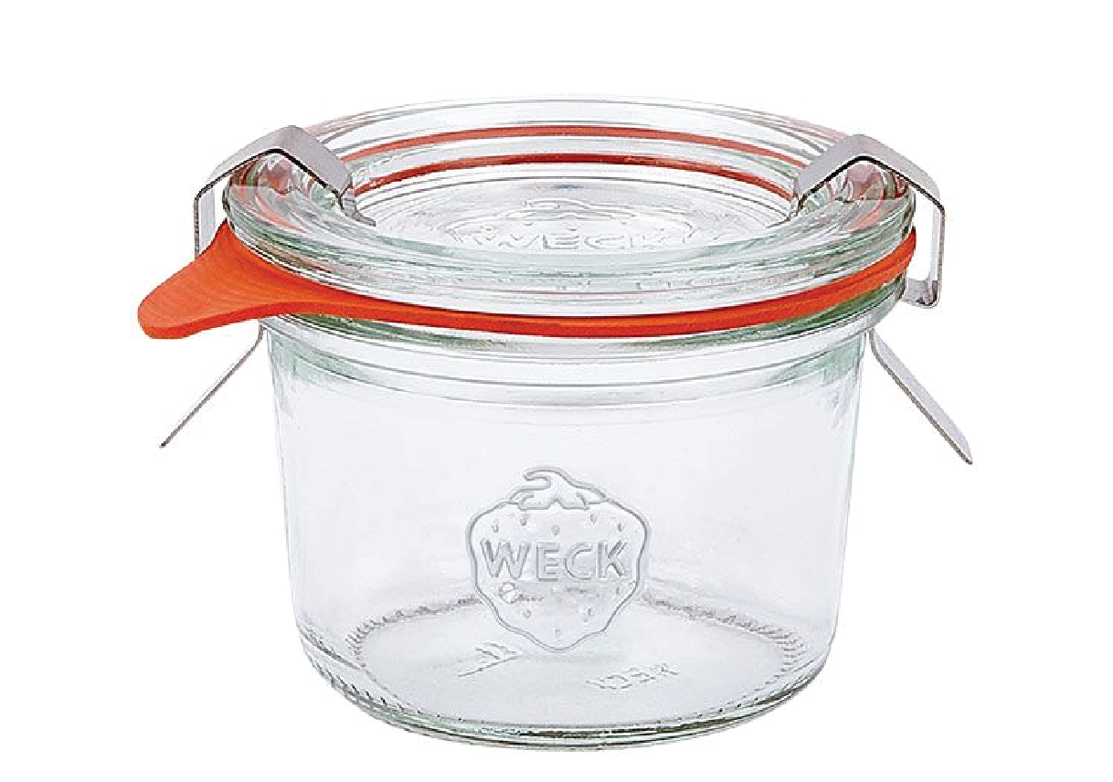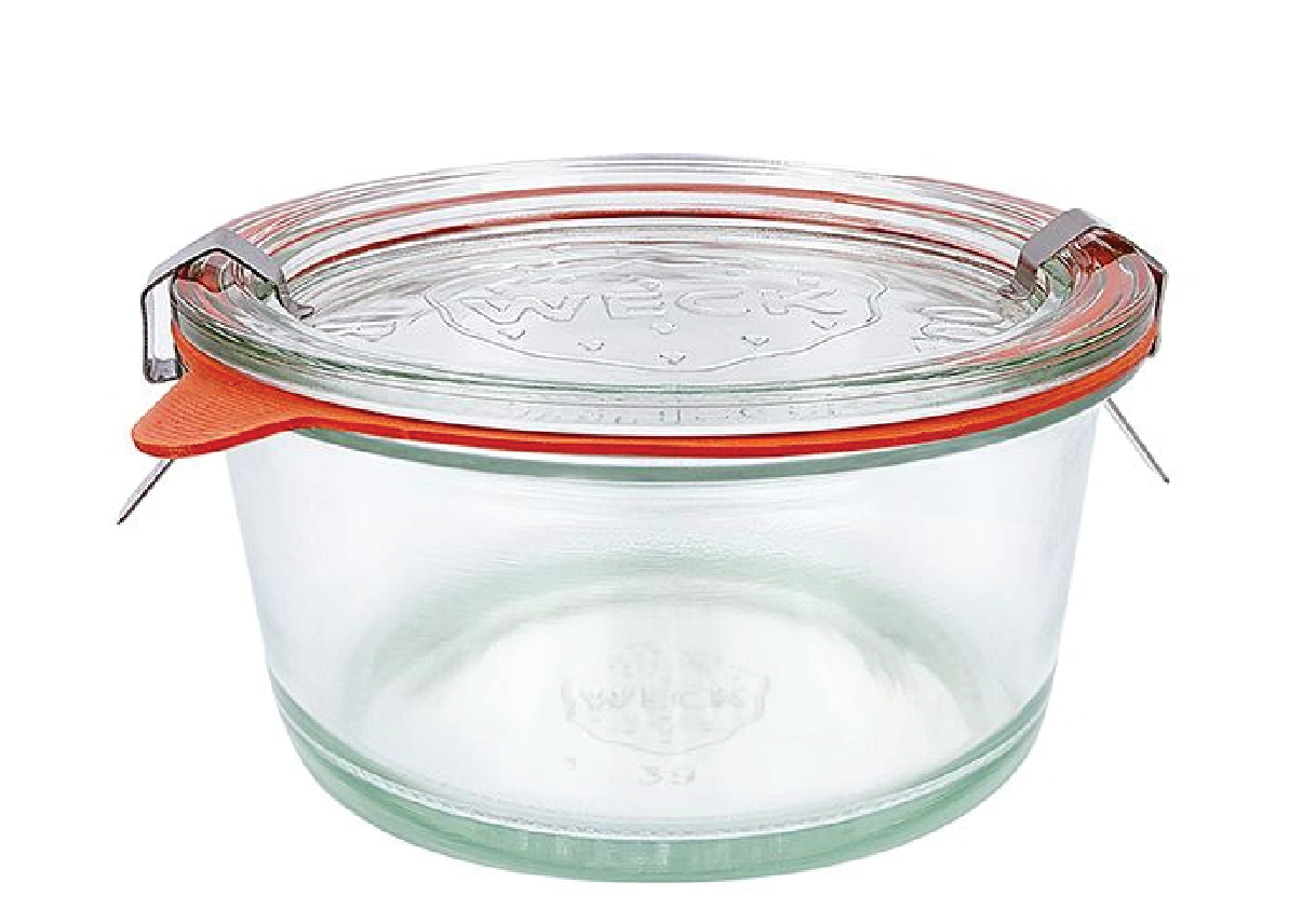 Weck Bowl 450mL (15. 2 fl oz. ). Use Size Extra-Large (120) Lids. Includes 1 Jar, Glass Lid, Rubber Ring and 2 Clamps