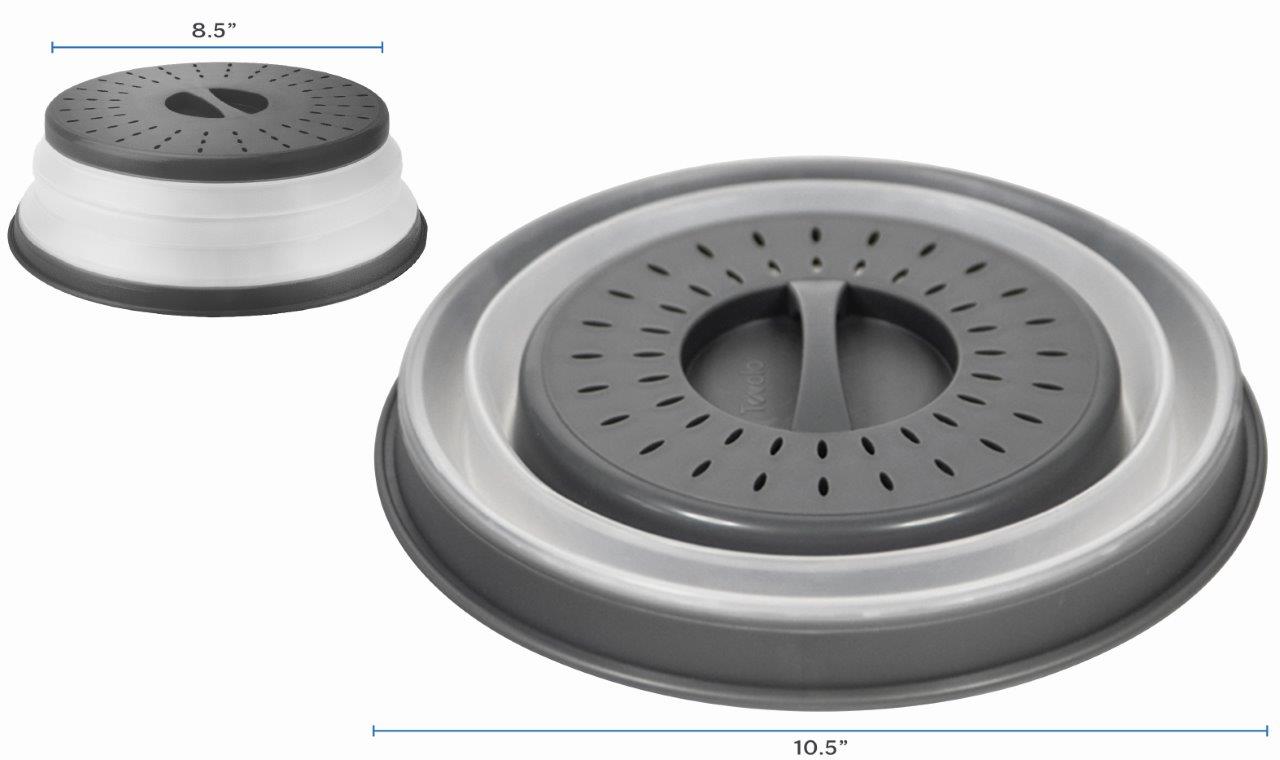 The Tovolo Collapsible Microwave Cover helps keep food moist and keeps the inside of your microwave clean by preventing splatter. The vented holes allow steam to release evenly, preventing condensation and steam buildup, which ensures your meal doesn’t overcook or dry out. This tool is designed to fit most small-size plates and bowls and is collapsible for compact storage. It's an essential kitchen tool in keeping your meal or food prep clean in an economically friendly fashion. This microwave cover is dishwasher safe, making for easy cleanup and less dirty dish build-up. With multiple uses, this collapsible cover can be used as a makeshift colander, straining water to clean fresh produce, berries, or vegetables. Made from high heat-resistant plastic, this kitchen gadget is a great way to minimize microwave messes and ensure an even cook every time.