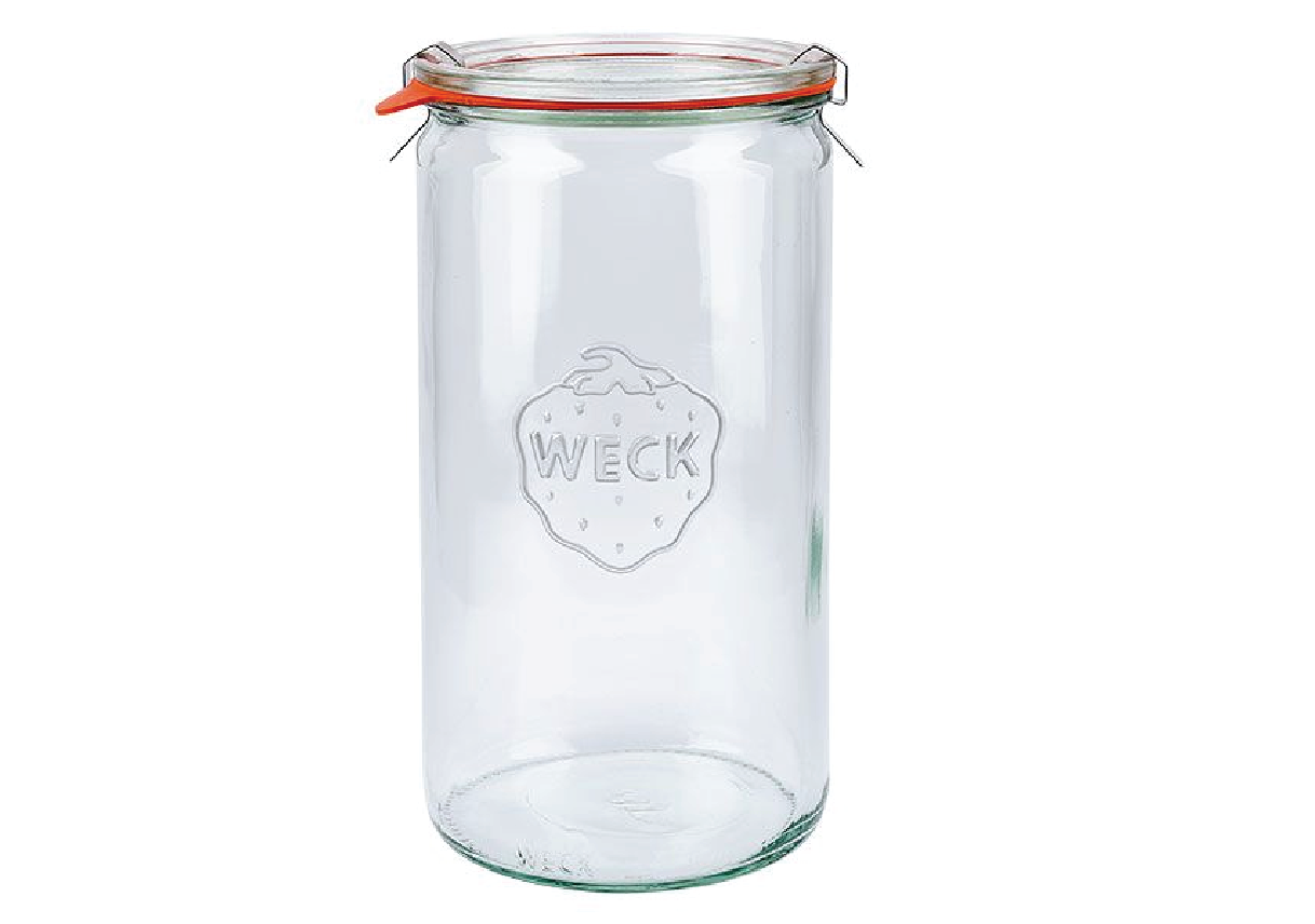 Cylindrical Jar 1 1/2 litre (54 fl oz. ). Use Size Large (100) Lids. Includes 1 Jar, Glass Lid, Rubber Ring and 2 Clamps