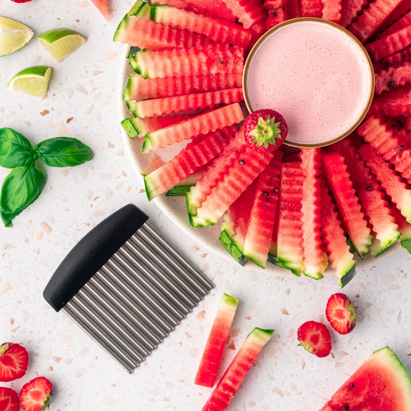 The Triangle Crinkle Cutter creates wavy cut slices, sticks and cubes for salads, fruit platters, for home-made wavy fries or for attractive butter presentation Due to its thin material and the ergonomic working direction it leaves very defined shapes and requires little force. Safe and easy to use it is also fun for children. Dishwasher-safe. Made in Solingen/Germany. Packaging: Box.
