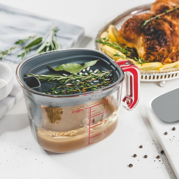 The Tovolo Gravy Strainer is an easy way to prepare and serve gravy for your next Thanksgiving dinner. This strainer can hold four cups of gravy, giving you and guests more than enough gravy to pour over turkey, mashed potatoes, stuffing, and more. The measuring lines for the four cups, as well as half-cup markings, makes this strainer a great measuring cup if you remove the lid, making it useful out of Thanksgiving season for general baking, measuring, and more. The detachable silicone strainer is designed to separate solids and liquids, giving you a pure, smooth gravy experience. The integrated interior tube on the lid of the strainer makes it easy to pour gravy over your dish without excessive fat. The handle makes for easy transportation and handling, rounding out this gravy strainer as a great solution in making the serving of gravy a breeze.
