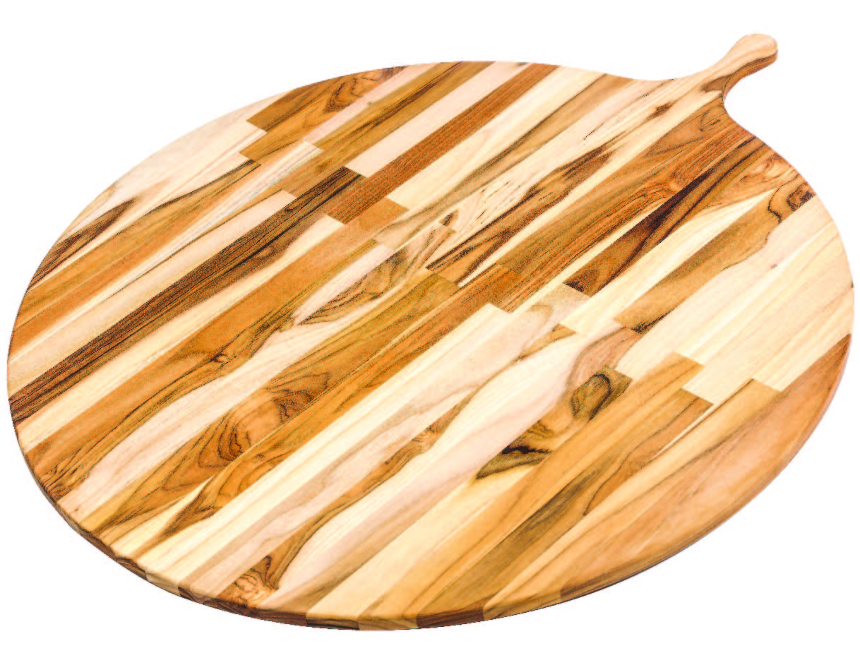 SPECIALTY COLLECTION - Atlas Round Serving Board (XL). Our Specialty Collection will serve as functional while being decorative. For epic charcuterie boards, from savory to sweet, elegant to laid-back, this board will surely become your favorite pick of any celebration. Round, Edge Grain, Handle, Reversible, Master Case of 1. 100% Sustainable teakwood. Handwash only, do not soak. FSC Certified Product. Teak is a tropical wood with a high oil content that acts as a moisture-resistant barrier. Its medium hardness provides a luxurious cutting experience and keeps your knives sharp. For mainteining use just a few drops of mineral oil, your boards will look like new again. Our zero-waste production process helps to minimize our environmental impact. All our teakwood comes from sustainable forests. FSC-certified, which means every purchase helps preserve nature, support sustainable forestry, protect biodiversity, cons