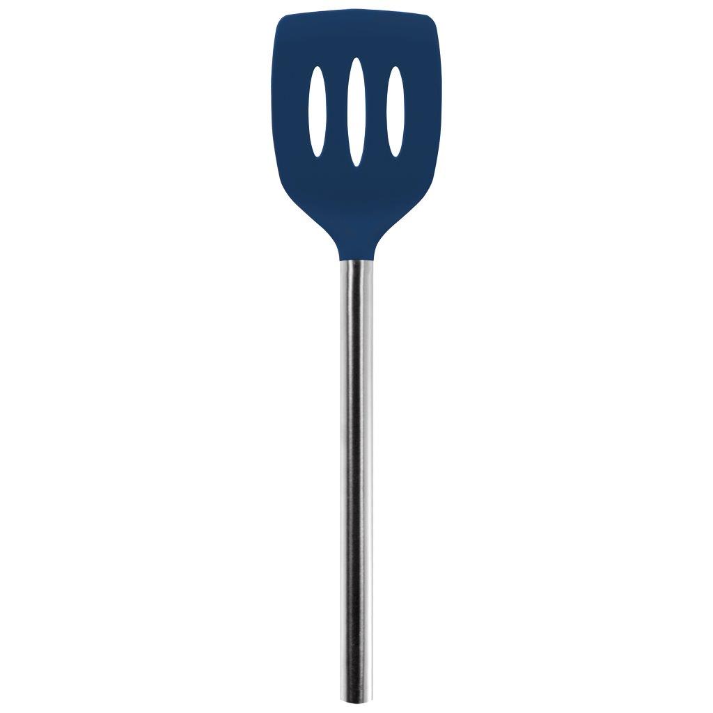 The Silicone Slotted Turner has a stain-resistant silicone head with elongated slots that prevent condensation. Tapered edges allow the turner to slide under food easily, while the stainless steel handle provides extra strength when lifting. Tapered edge allows it to slide under food easily. Silicone head is scratch-resistant. Long-lasting, stain-resistant color. Stylish stainless steel handle.